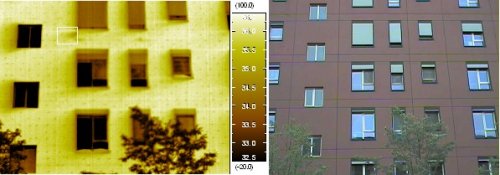 ![]() 紅外熱像法檢測某住宅樓建筑節能構造缺陷(局部位置由于施工原因造成建筑節能構造缺陷) 紅外熱像法檢測幕墻滲漏與安全性