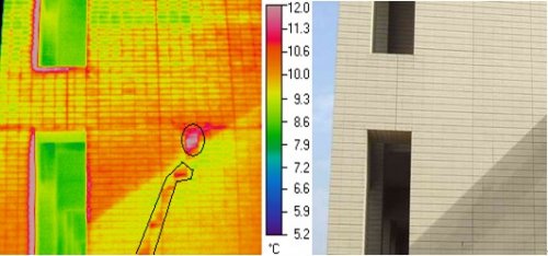 ![]() 紅外熱像法檢測某試驗樓外墻飾面粘結質量(多處出現空鼓) 紅外熱像法檢測建筑節能構造缺陷