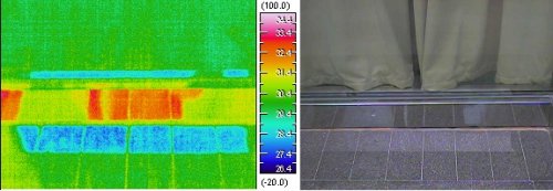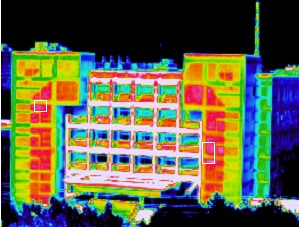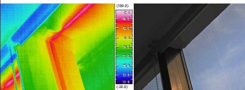 ![]() 幕墻開啟扇紅外熱像圖中高溫帶,為開啟扇滲漏室外熱空氣所致 |