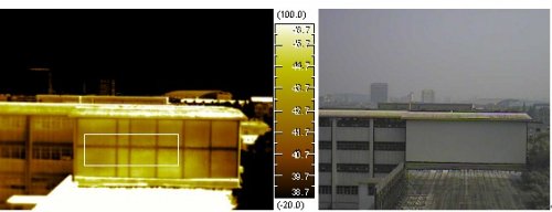 ![]() ![]() 紅外熱像法檢測某銀行辦公樓樓頂外表面(防水層失效造成雨水滲入)