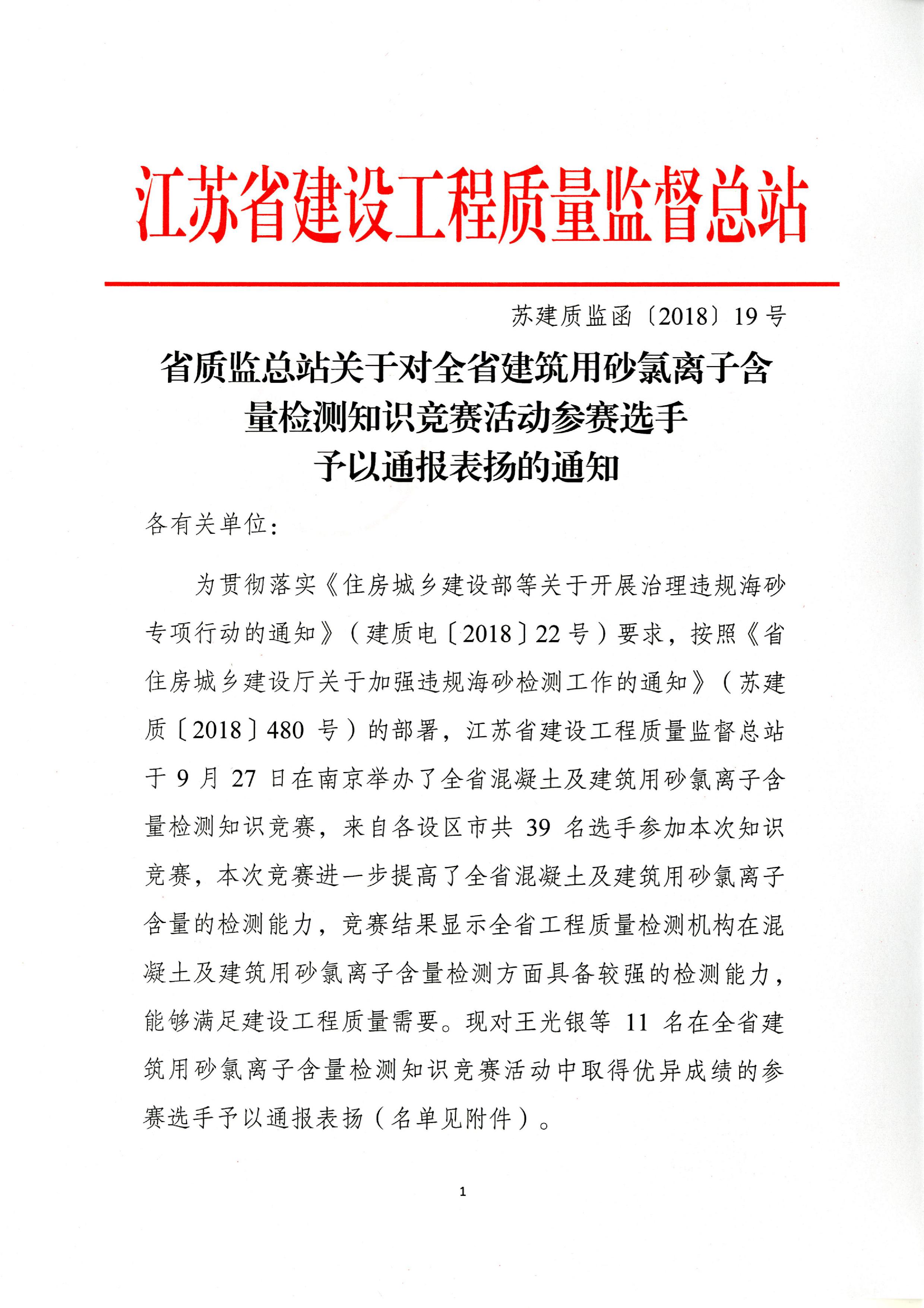 | 省質監總站關于全省建筑用砂氯離子含量檢測知識競賽活動參賽選手予以通報表揚的通知 |