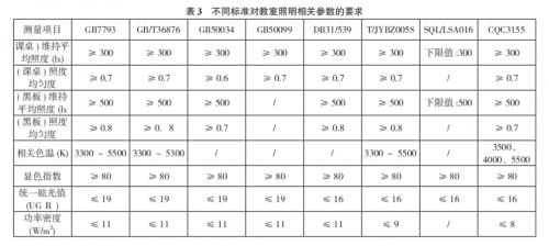 目前我國關于中小學教室照明標準包括國家標準、團體標準、地方標準及技術指引。部分標準中關于教室照明相關參數的要求見下表1。 表1 不同標準對教室照明相關參數的要求